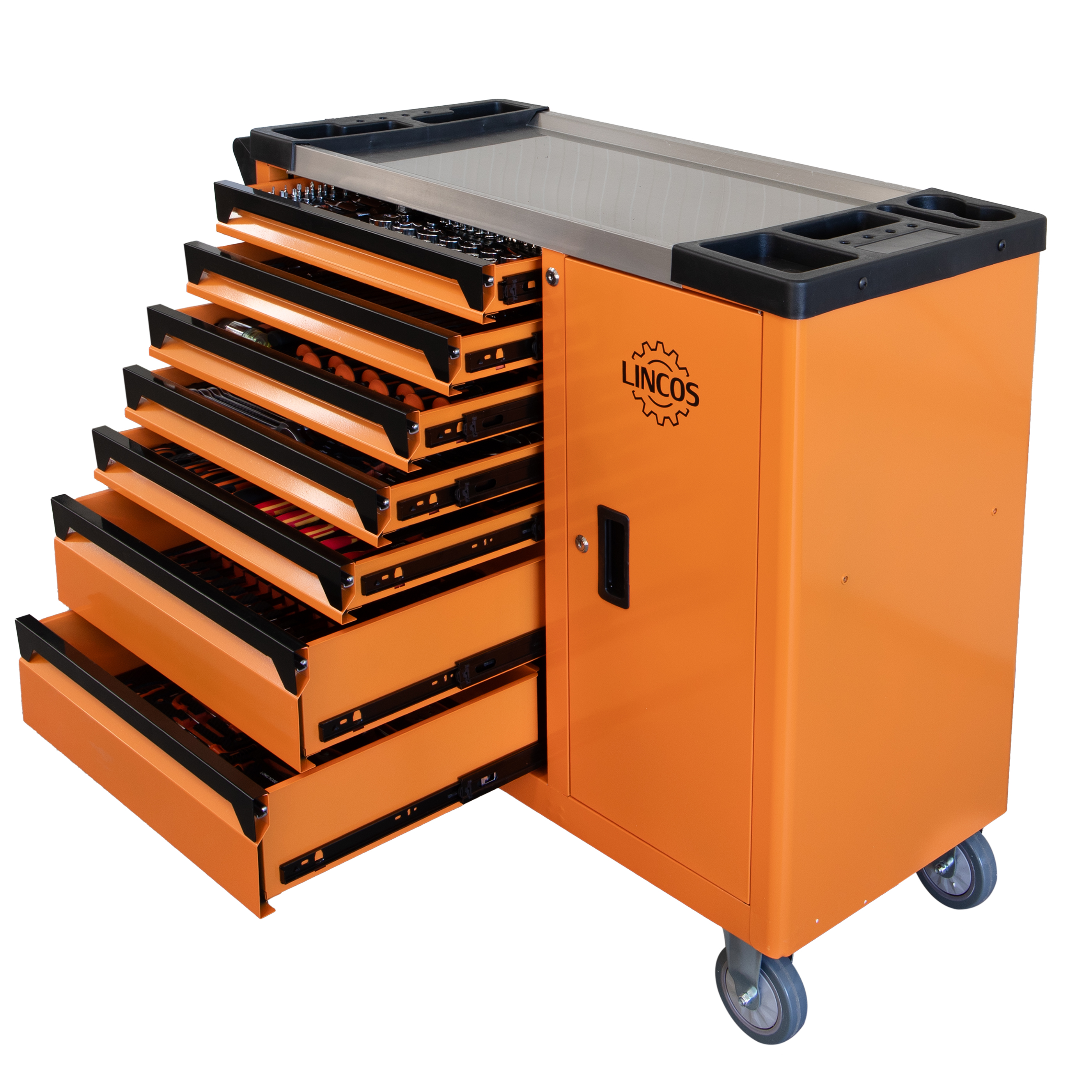 Pojazdný dielenský vozík so 7 zásuvkami, kompletne vybavený 407-dielnou sadou náradia. Zásuvky s tlmeným dovieraním, uzamykateľné kolieska a široký výber kvalitného náradia na rôzne dielenské práce.