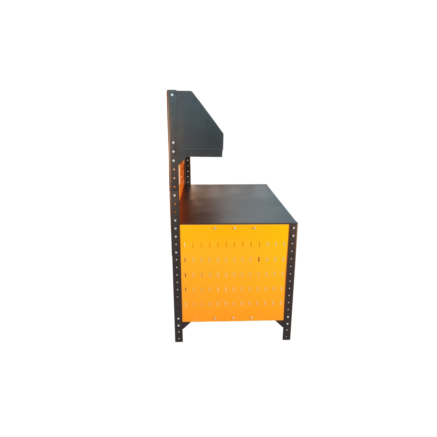 Univerzálny kovový dielenský stôl. Môže byť použitý v skladoch, dielňach. 125x75cm vystužená kovová pracovná doska. Perforovaná bočná/zadná stena. Spodná/horná polica. Výška: 80/155cm.