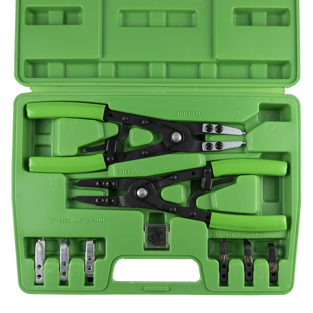 Súprava klieští na poistné krúžky s vymeniteľnými hrotmi. Interný a externý.