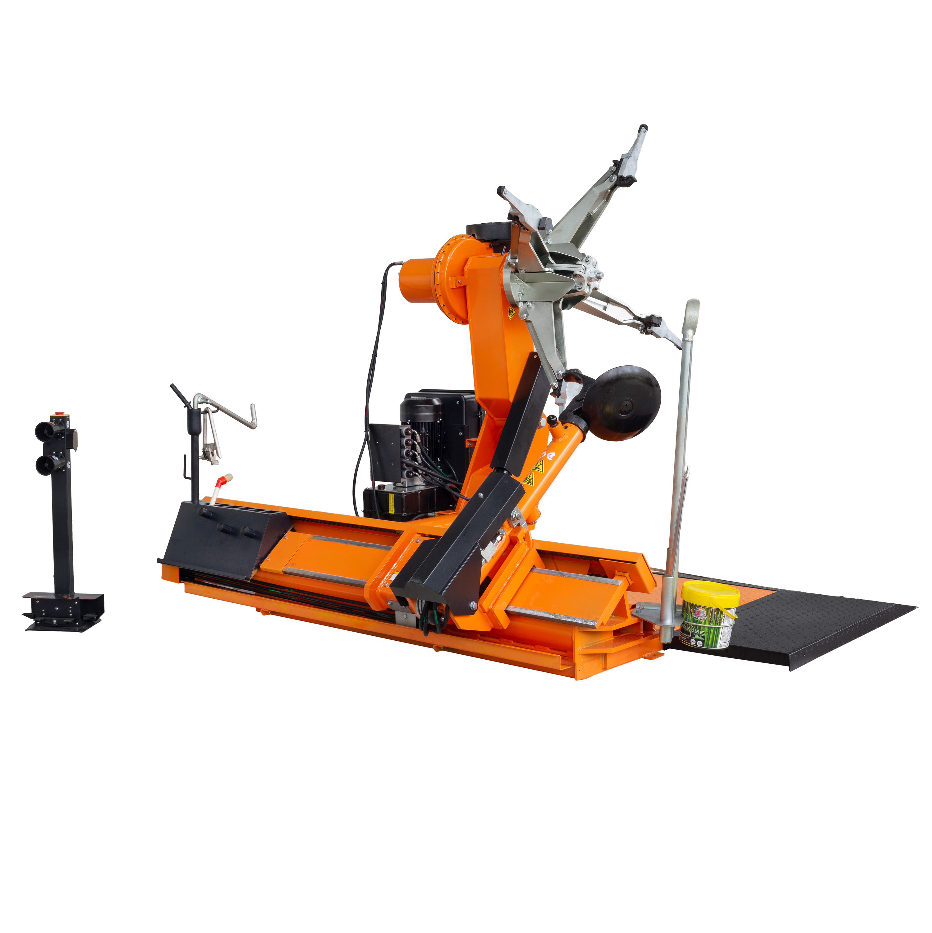 Elektro-hydraulická automatická vyzúvačka pneumatík pre kolesá poľnohospodárskych, nákladných vozidiel, autobusov, kamiónov, rozsah uchytenia 14"-56", max. priemer kolesa 2500mm, max. šírka kolesa 1200mm, ovládacie prvky sú umiestnené na prenosnom stojane