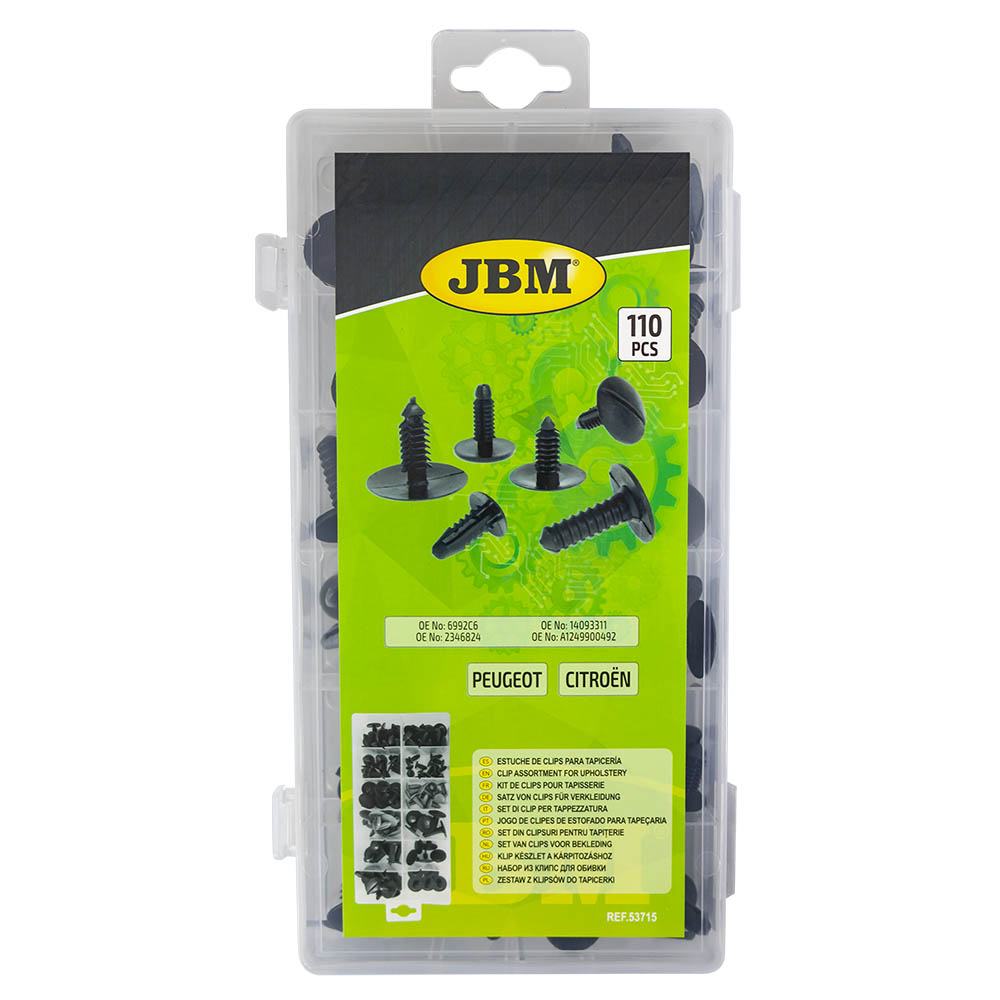 350-dielna univerzálna sada plastových klipov, vrátane 12 typov hnacích nitov kompatibilných s BMW, Daewoo, Ford, GM, Land Rover, Mercedes-Benz, Peugeot, Volvo, VW Group (Audi, Seat, Škoda, Volkswagen) a všeobecnými aplikáciami.