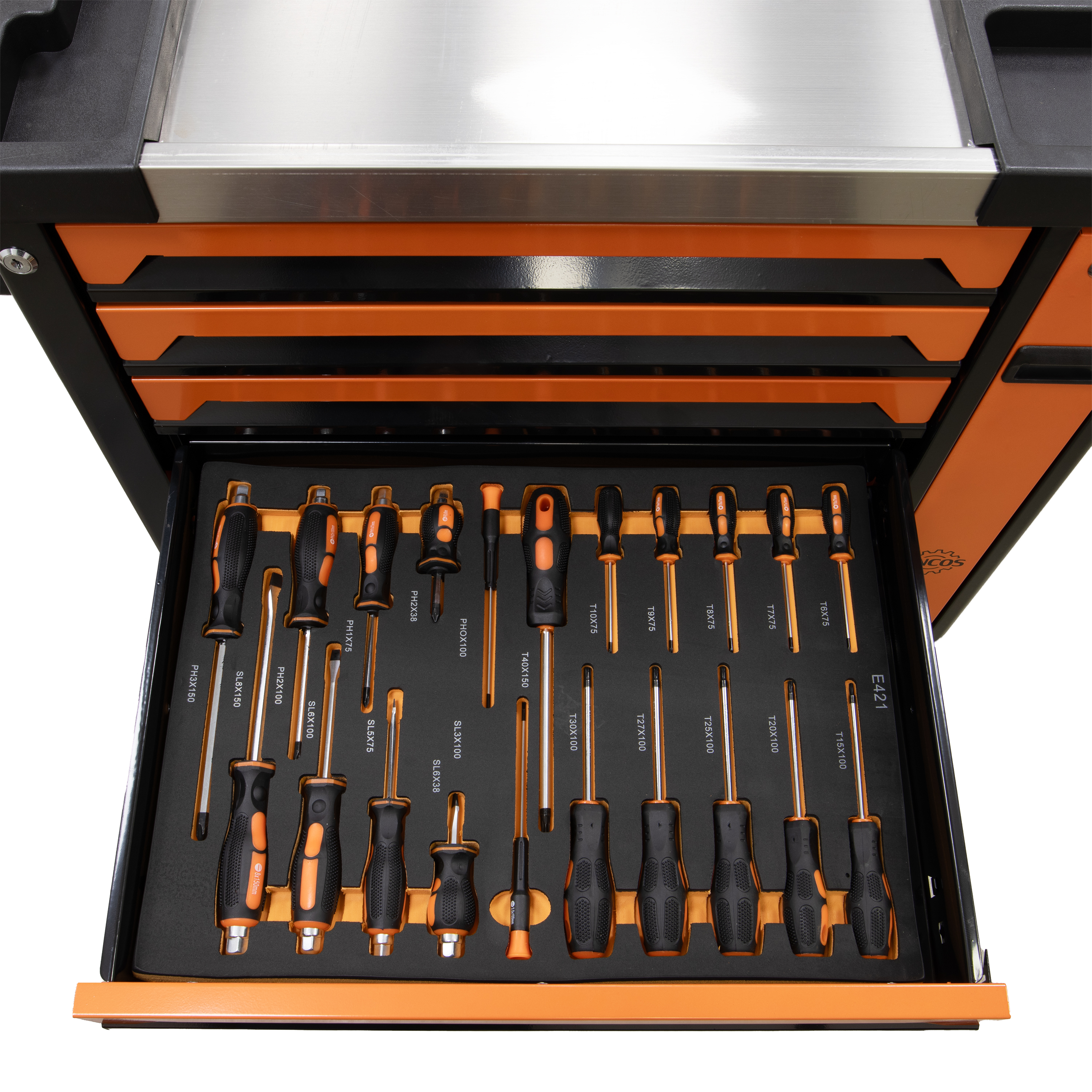- 14 obojstranných skrutkovačov (T45X100, T50X200, T10X75, T15X100, T20X100, T25X100, T30X150, H6X150, H5X150, H4X150, H3X1020, H2X0, H2X0, H2X0)