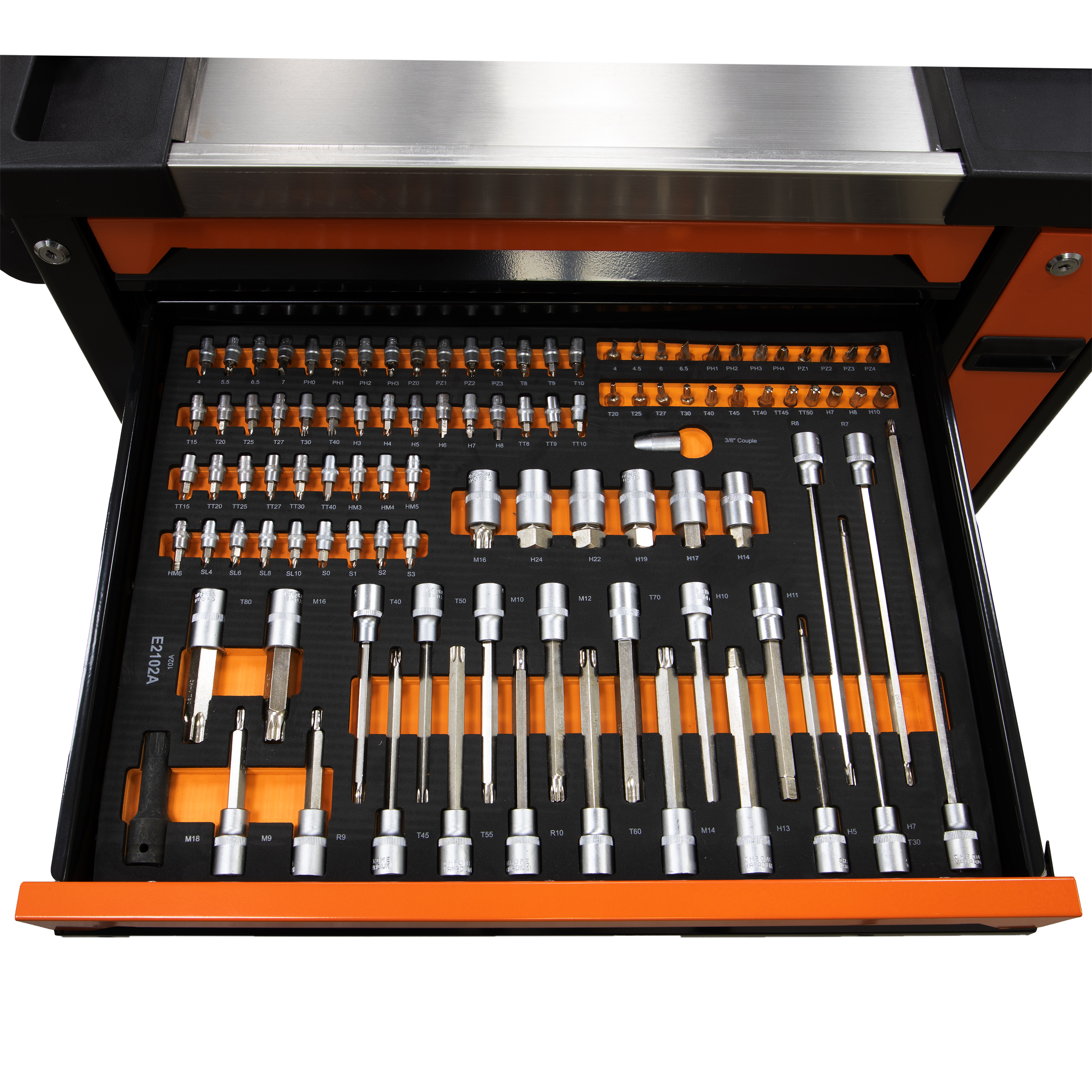 263-dielna súprava náradia, ktorá je súčasťou skrinky, poskytuje rozsiahlu zbierku základných nástrojov, vďaka čomu budete mať všetko, čo potrebujete pre širokú škálu projektov. Od kľúčov a klieští až po skrutkovače a šesťhranné kľúče, táto súprava vás pokryje pri rôznych úlohách a opravách.