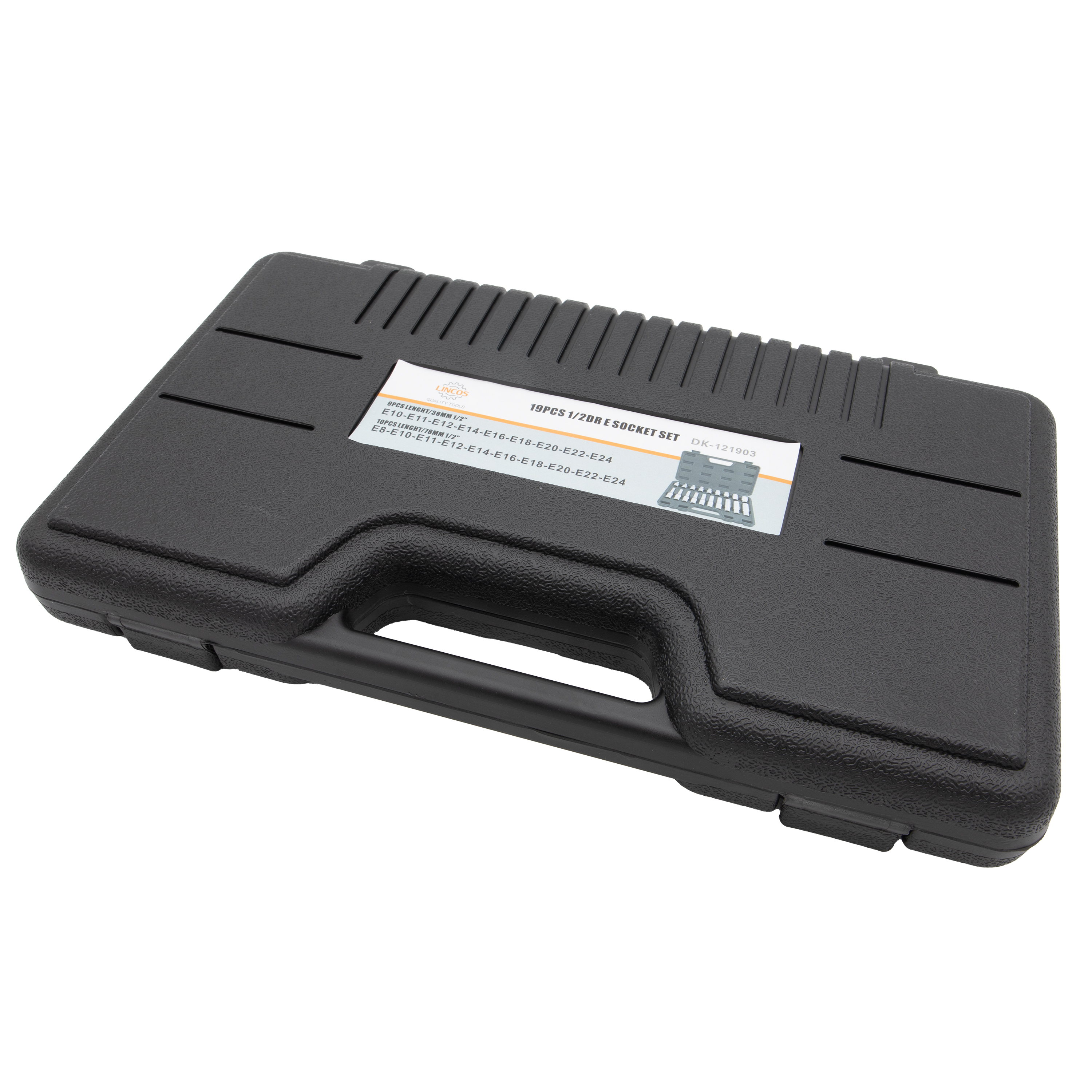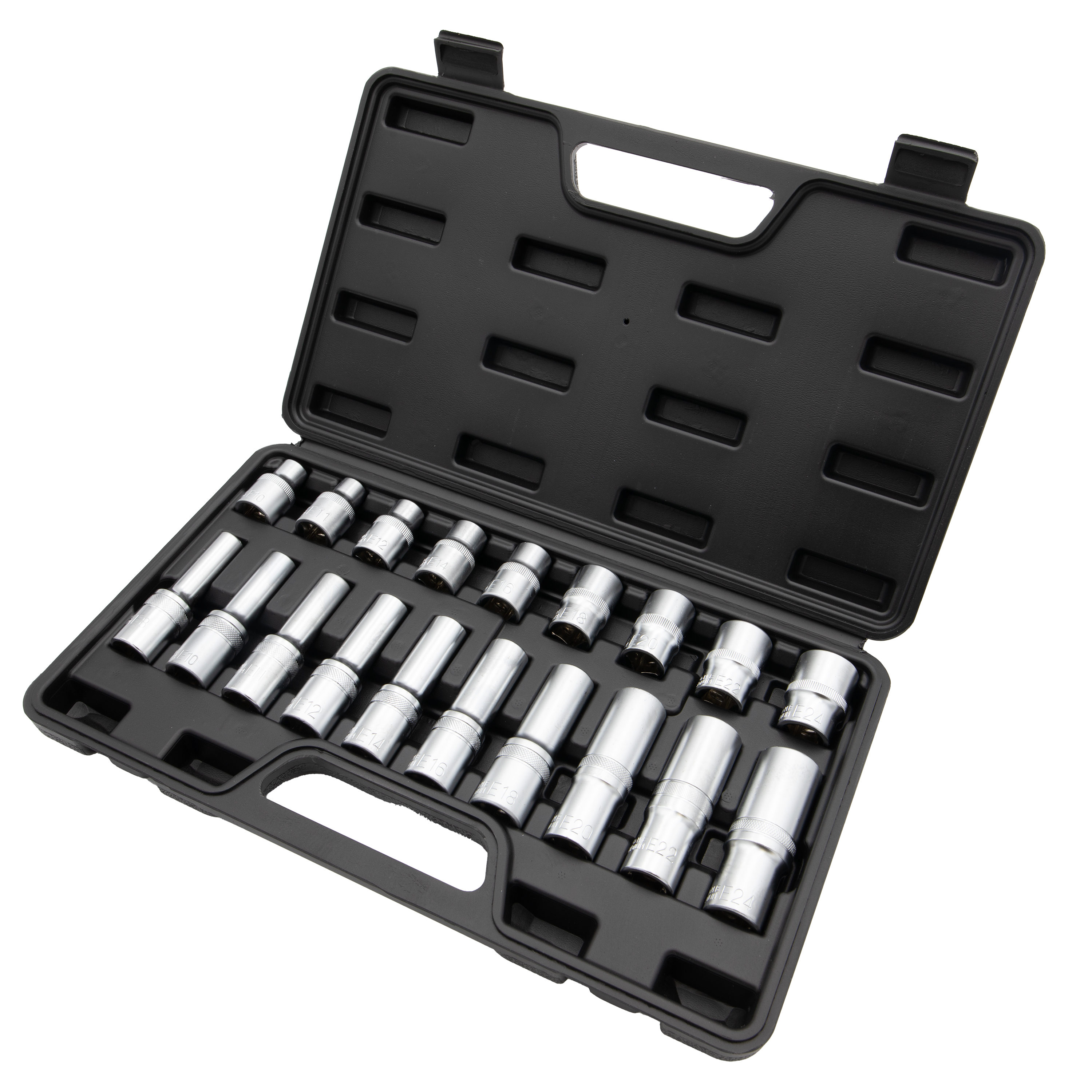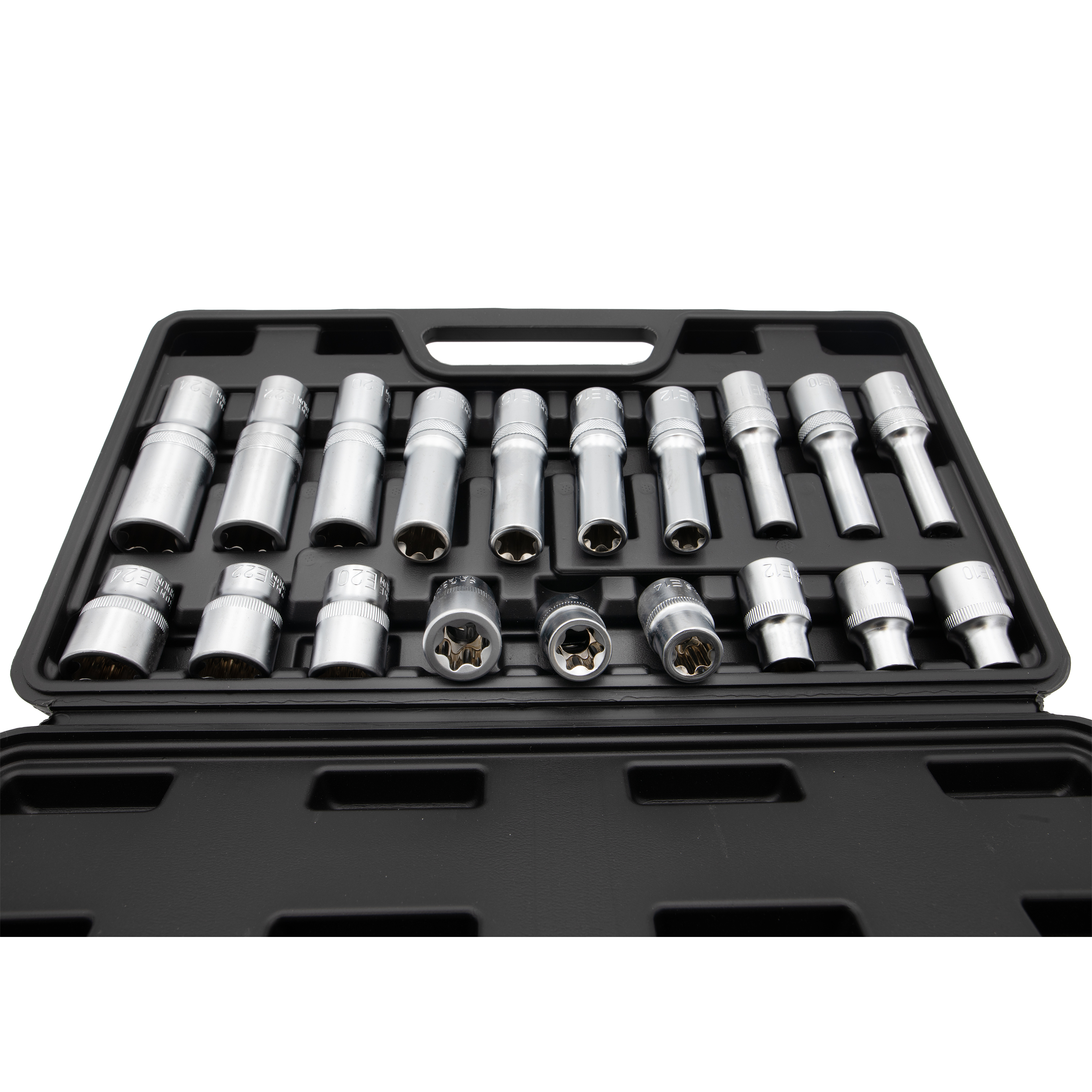17-dielna sada hlavíc E-profil a bitov Torx v 1/2" hlavici. Obsah: T30, T40, T45, T50, T55, T60, T70, E10, E11, E12, E14, E16, E18, E20, E22, E24.