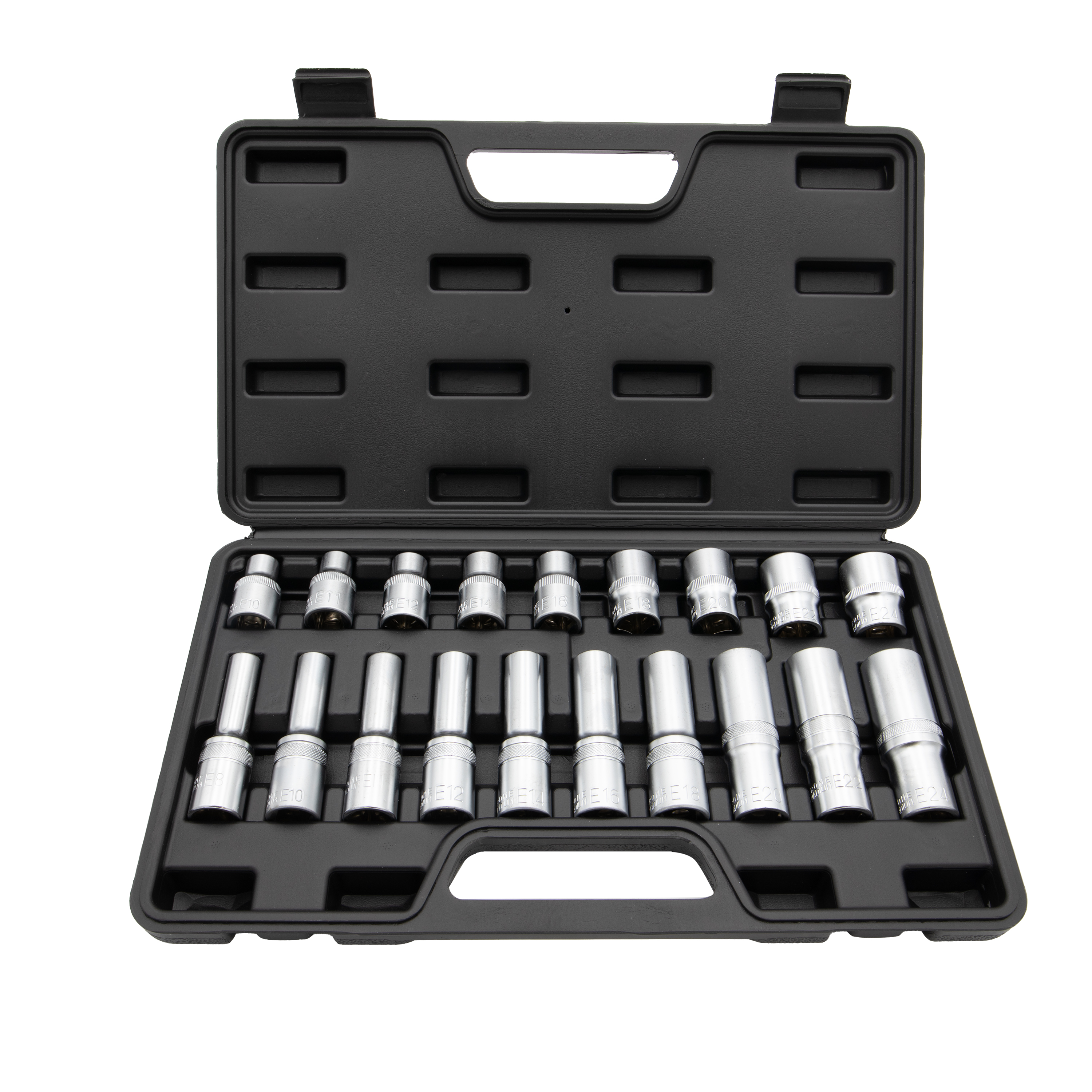 Sada Torx orechov. 28-dielna: 1/4”: E4, E5, E6, E7, E8; 3/8”: E10, E11, E12, E14, E16; 1/2”: E18, E20, E22, E24; Dlhé a krátke prevedenie