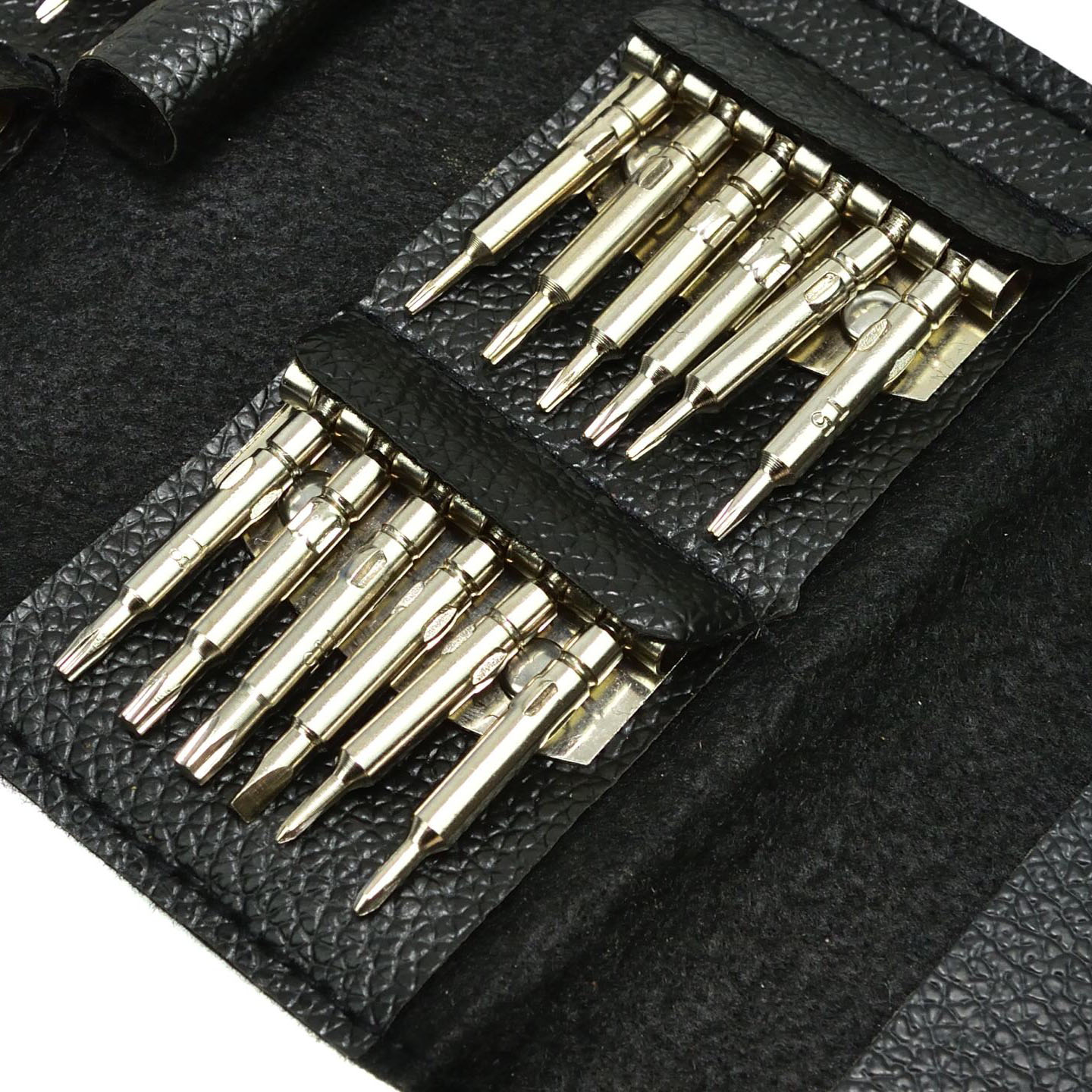 Všetko je umiestnené v praktickom peňaženkovom obale z ekokože. Každý skrutkovací nástavec perfektne sedí na rukoväti a dá sa ľahko vymeniť.