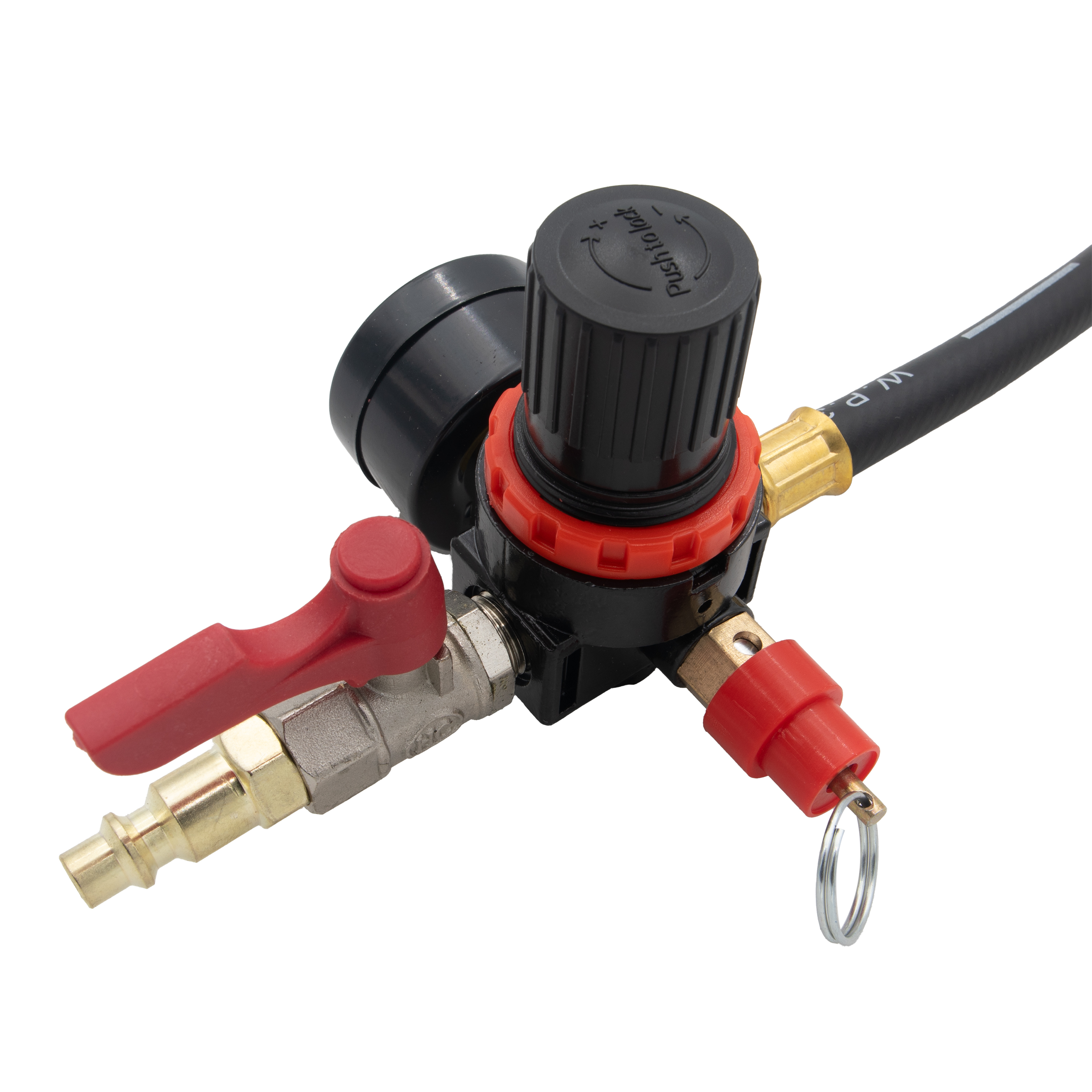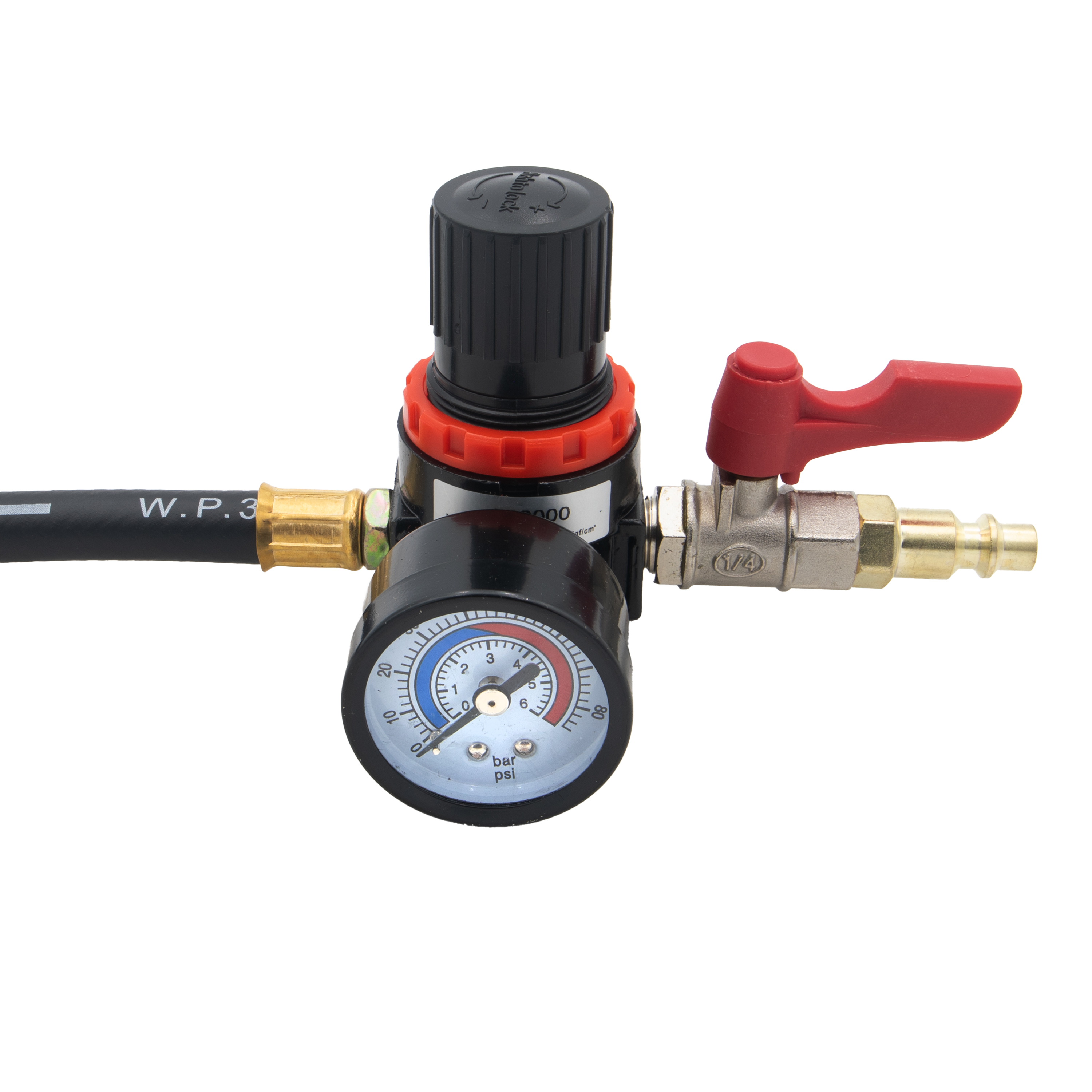 Systém je vybavený quick-connect regulačným ventilom a odpúšťacím ventilom pre prívod stlačeného vzduchu. Testovanie prebieha simuláciou tlaku generovaného turbo (1-1.7 bar) – adaptér sa utlmí na výstupe (strana sacieho potrubia) a pripojí sa k regulátoru na vstupe (strana turbo). Aktiváciou ventilu stlačeného vzduchu pomocou vzduchovej pištole možno odhaliť aj minimálne praskliny podľa úniku vzduchu alebo poklesu tlaku v okruhu.