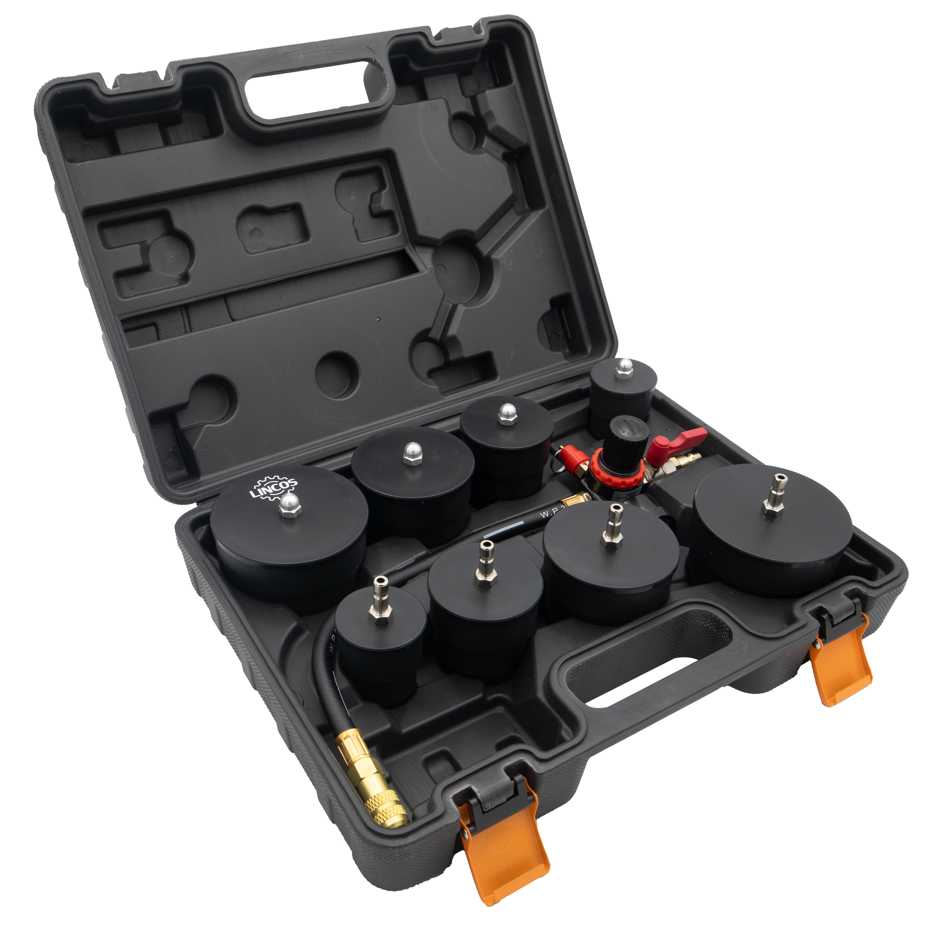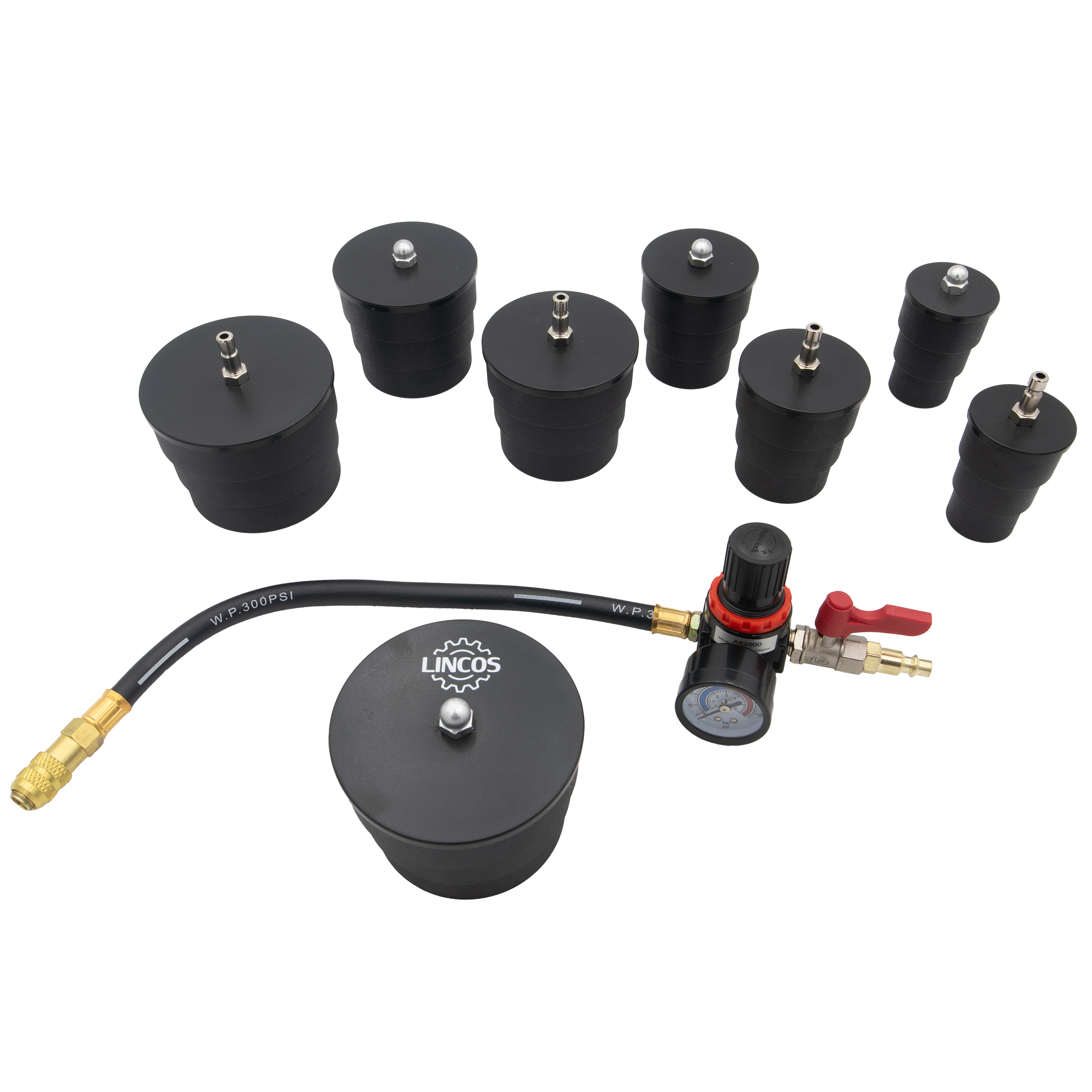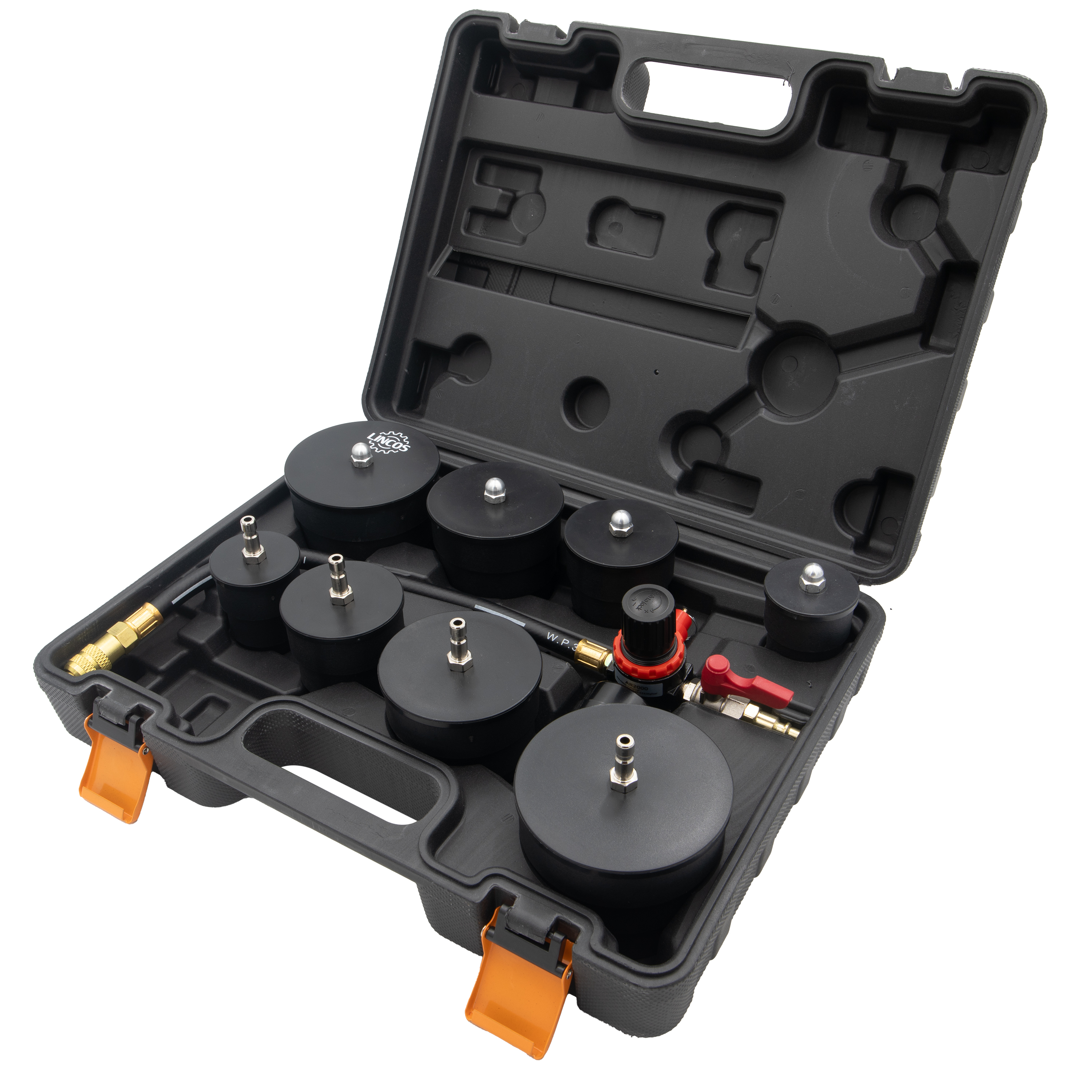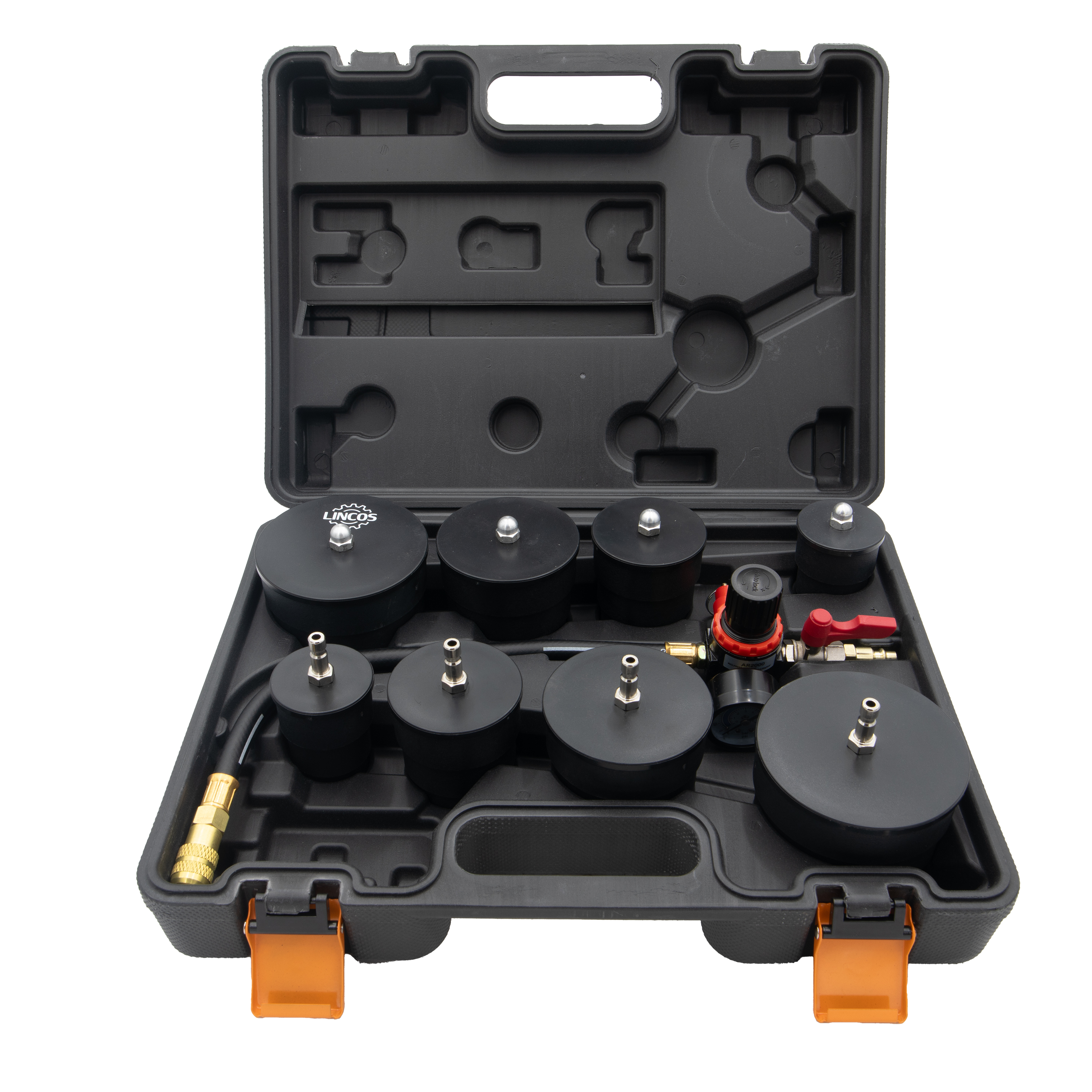 Tento 9-dielny testovací set na turbo kompresor slúži na rýchlu detekciu únikov vzduchu a prasklín v intercoolerových hadiciach a potrubiach spájajúcich turbo kompresor so sacím potrubím. Súčasťou je tlakomer s rozsahom 0-70psi (0-5 bar) pre presné monitorovanie tlaku počas testovania. 8 kužeľových adaptérov s veľkosťou 35mm až 80mm zabezpečuje kompatibilitu s rôznymi priemermi hadíc, čím je set vhodný pre širokú škálu vozidiel a systémov s pretlakom.