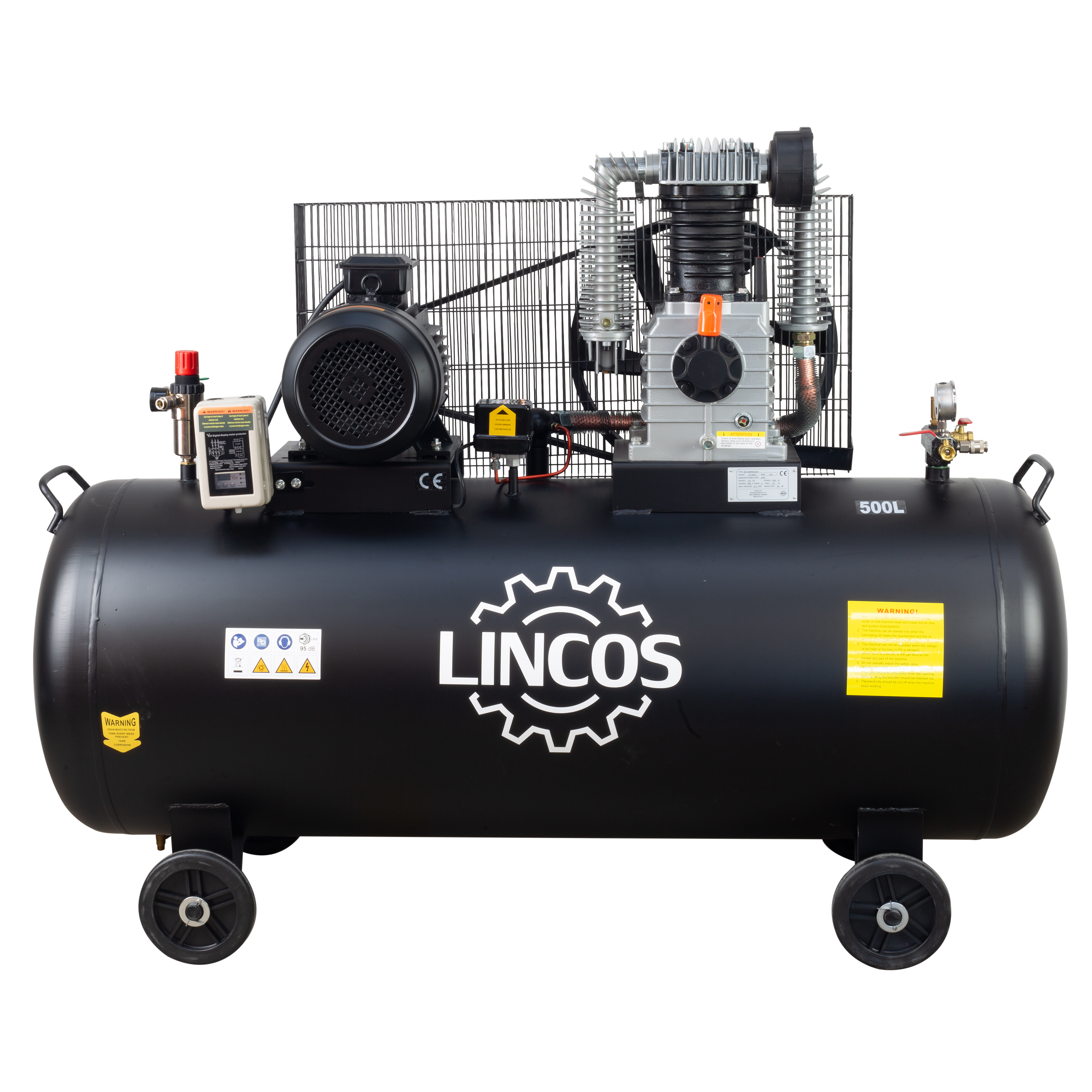 Kompresor poháňaný klinovým remeňom, olejom mazaný kompresor, blok vzduchového kompresora v tvare H, motor s medeným vinutím, 1000 l / min, nádrž 500 l, 5,5 kW (400 V), 12,5 bar, 4 pevné kolesá.
